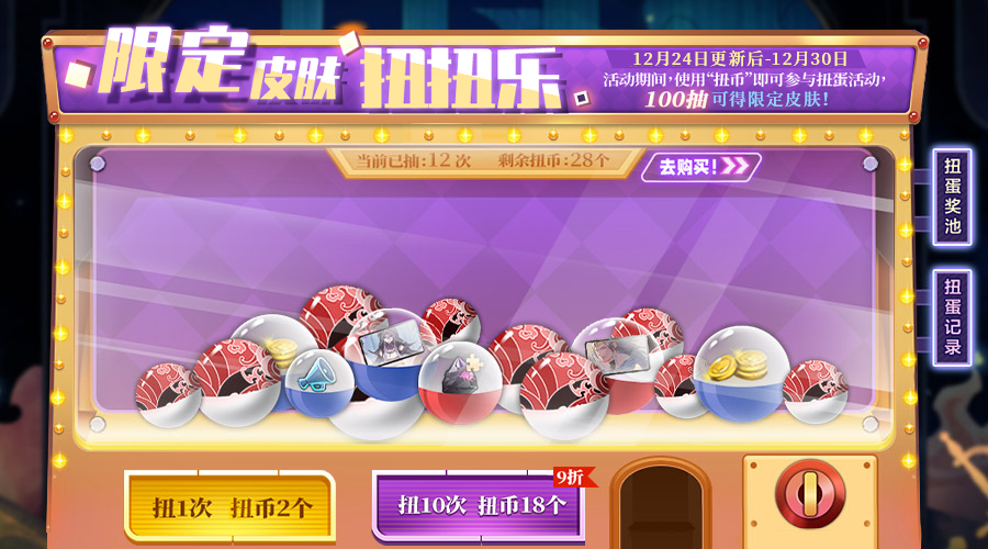 活动期间,使用“扭币”即可参与扭蛋活动,100抽可得限定皮肤!