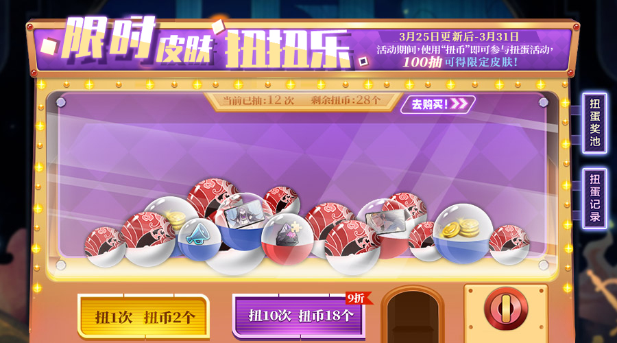 活动期间,使用“扭币”即可参与扭蛋活动,100抽必得限定皮肤!