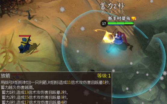 D技能:对目标射出一只利箭,对目标造成11倍术攻伤害且眩晕1秒,蓄力越久伤害越高。蓄力1秒,造成13倍术攻伤害眩晕2秒。蓄力2秒,造成15倍术攻伤害眩晕3秒。蓄力3秒,造成17倍术攻伤害眩晕4秒。