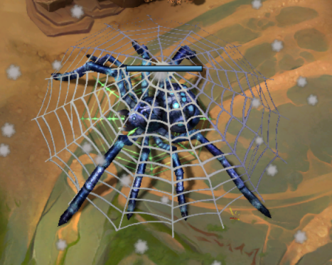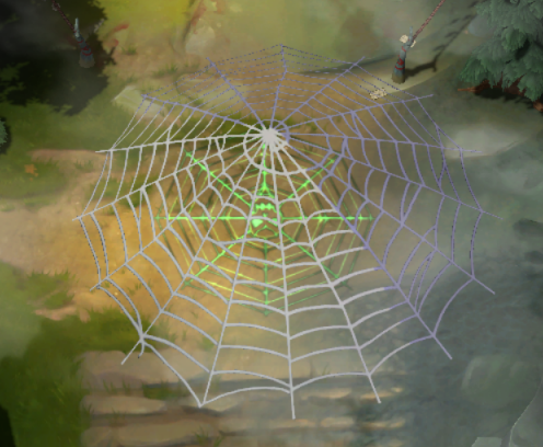 Q技能:创造一个蛛网,使网里的敌人减速15/20/25/30%,友军增加25/50/75/100%攻击速度,5/10/15/20%移动速度(只能存在一个蛛网)